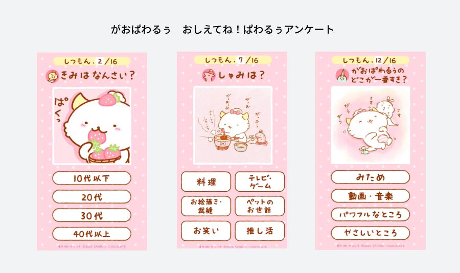 アンケート体験をファンの皆様に楽しんでいただけるよう「がおぱわるぅの世界観」とのリンクを意識しました。設問とリンクしているイラストを入れているのですが、最近のイラストだけでなく少し懐かしさを感じられるようなイラストを入れるなど、設問と絵の組み合わせを工夫しながら制作を進めました。