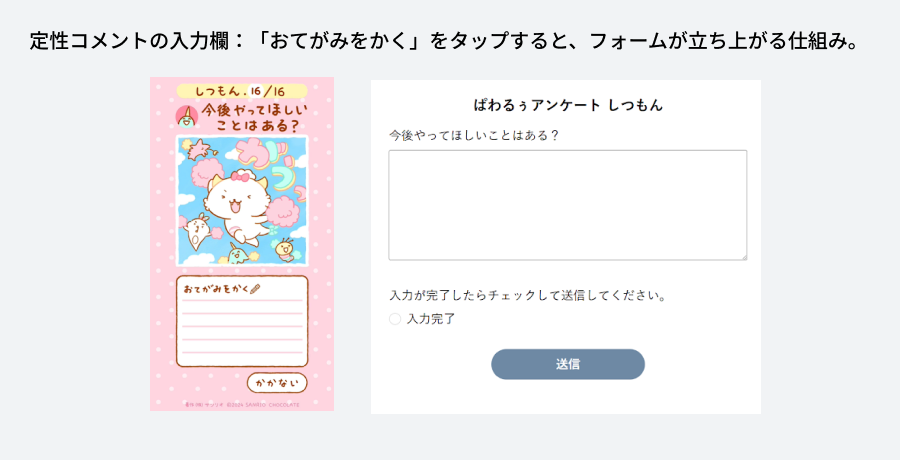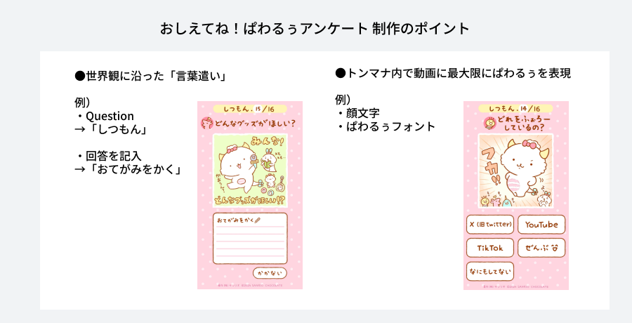 また、SNS起点でキャラクターを知り好きになった方が多いので、SNSやスマートフォンと距離が近い方々が多いはずと推測し、自身のスマートフォンで回答できる体験的なアンケートであれば、ファンの方にも負担を感じずに答えていただけるのではと考えました。